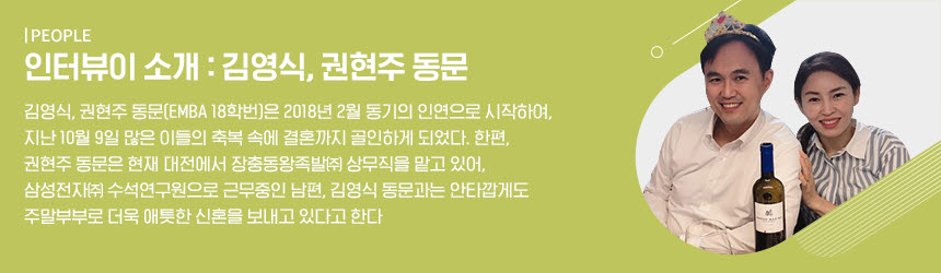 한창 달콤한 신혼 생활을 만끽하고 계실 EMBA 10기 김영식♥권현주 동문 부부. 조금은 쑥스러워 하시면서도 인터뷰에 적극적으로 응해주신 두 분의 아름다운 러브스토리를 들어보았습니다.