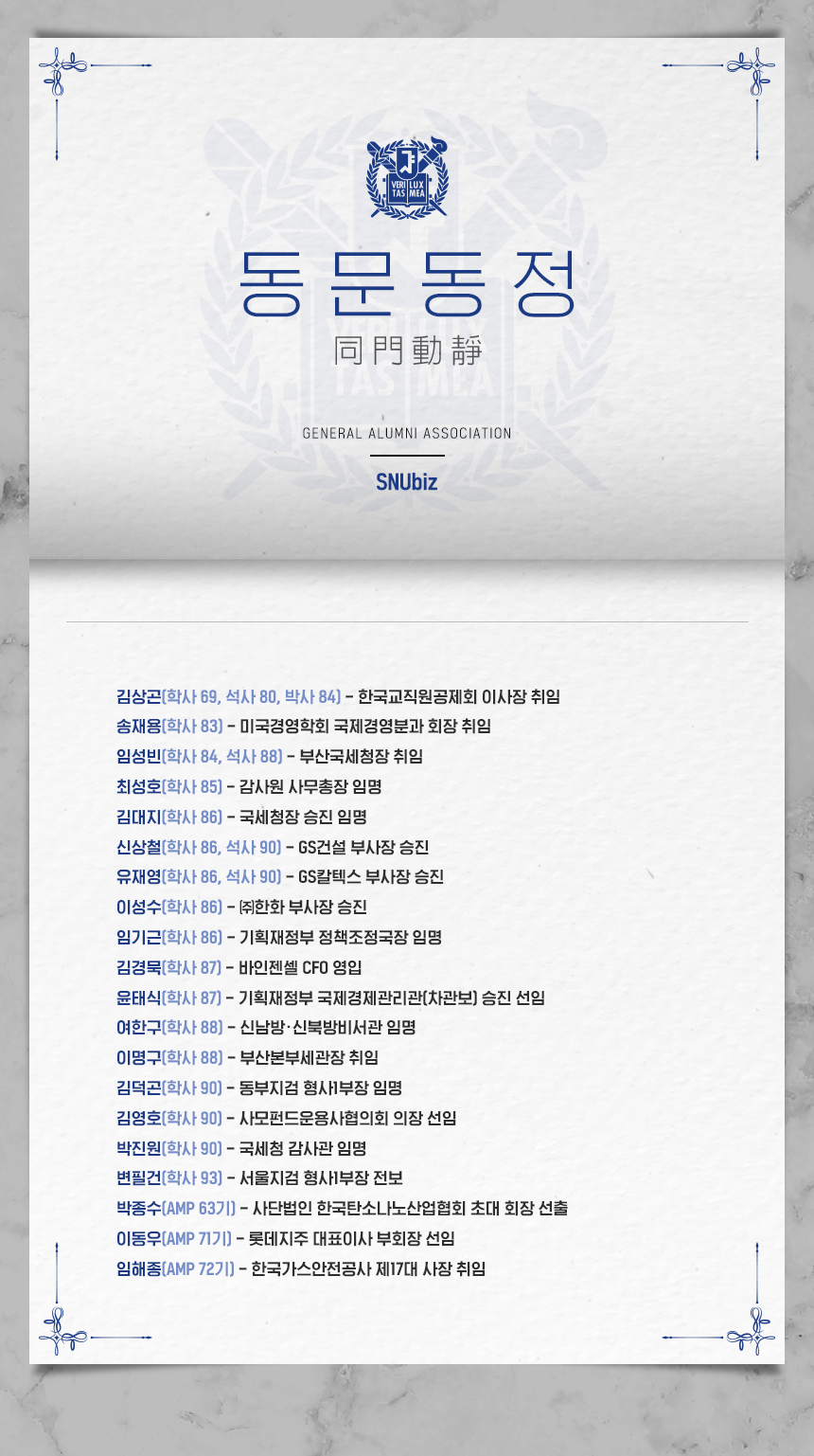 서울대학교 경영대학(원) 동문의 최신 동정입니다. (2020년 12월 기준)