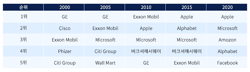 과거 20년간 미국 S&P 상위 기업은 제조 기반인 IBM, GE, Exxon Mobil, P&G, Coca-Cola 등이 상위권에 위치했지만, 현재는 무형경제를 주도하는 MAFAA가 1위~5위를 장악하고 있다. 제조업체는 큰 차이로 후순위로 밀려나고 있는 것이다.