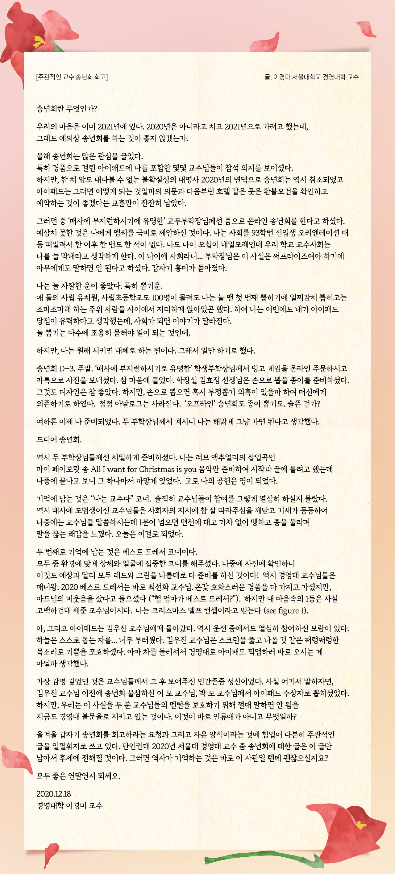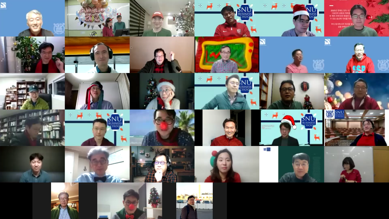 2020년도 서울대학교 경영대학 교수 송년회가 12월 1일 Zoom을 통해, 총 34분의 교수님께서 온라인으로 참여하신 가운데 진행되었습니다.