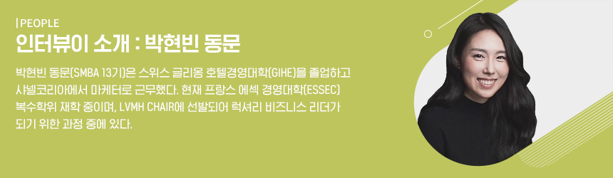 MBA를 시작하기 전, CHANEL KOREA에서 마케팅 업무를 담당했습니다. 이 경험을 통해 향후 럭셔리 업계에서 커리어를 쌓고 싶다는 생각을 했고 자연스레 비즈니스 리더로서 필요한 소양에 관심이 생겼습니다. 그러던 중 리서치를 통해 LVMH CHAIR를 알게 되었습니다. LVMH(Louis Vuitton Moët Hennessy)는 프랑스의 세계 최대 명품기업으로 루이비통, 디올, 티파니 등 75개의 명품 브랜드를 소유하고 있으며 사업군은 패션, 주얼리, 코스메틱, 와인과 스피릿까지 아우르고 있습니다.