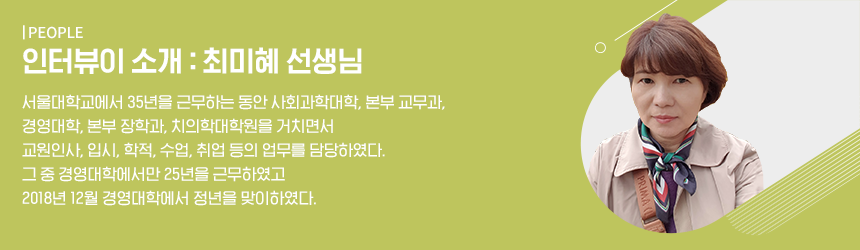 워킹맘으로 가정생활과 아이도 잘 키우고 직장에서도 인정받는, 일 가정 양립은 생각처럼 쉽지 않았습니다. 직장에서는 아이 생각, 집에서는 미처 끝내지 못한 업무 생각으로 이리저리 뒤채이며 힘든 날이 많았습니다. 그래도 업무에서만큼은 누구에게도 의지하고 싶지 않다고 생각했습니다. 업무에 대한 저의 가치는 책임감을 최우선으로 하고 힘든 일은 피하지 않고 적극적으로 추진하고 실행했습니다. 그러다 보니 일 속에서 즐거움도 느끼고 업무에 대한 생각과 자세가 긍정적으로 변화되었습니다. 무엇보다 교수님과 학생들에게 행정의 전반적인 도움을 드리고 신뢰받는 직원이 되도록 노력하였고 직원들과의 소통과 협력을 위해 애썼던 것이 경영대학과 서울대학교에서 오랫동안 근무하게 된 비결이라고 생각합니다.
