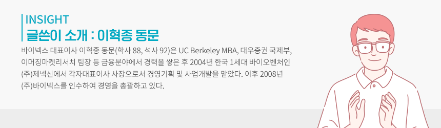 경영학 전공자로서 금융으로 경력을 시작한 후 현재 18년째 바이오산업에 종사하고 있는 필자는 경영학도들이 어려운 용어와 기술자들만의 산업이라는 인식 등으로 헬스케어 산업에(특히 바이오) 거리를 두어 많은 기회를 놓치고 있다는 점을 아쉽게 생각한다. 현재 헬스케어 산업은 끊임없이 변화하고 시장규모가 기하급수적으로 커지고 있을 뿐 아니라 최근 바이오 기업들이 단순 원대한 꿈을 펼치는 기술개발에만 그치지 않고 영리적인 성과를 달성하고 있다는 점은 이러한 성장이 단순 버블이 아니라 실질적인 산업화가 이뤄지고 있다는 것을 증명하고 있다. 따라서 반도체 산업과 마찬가지로 헬스케어 산업에서도 경영학도들의 역할이 단순 회계나 재무 분야로 한정되어 있지 않고 “헬스케어 산업화”라는 큰 흐름 속에서 경영학 전공자들이 할 수 있는 일들은 무궁무진하다고 생각한다. 이 글이 헬스케어 시장에 막연한 거부감을 가지고 있는 분들에게 새로운 문을 열고 큰 발전의 기회를 얻을 수 있는 도전의 계기가 되길 바란다.