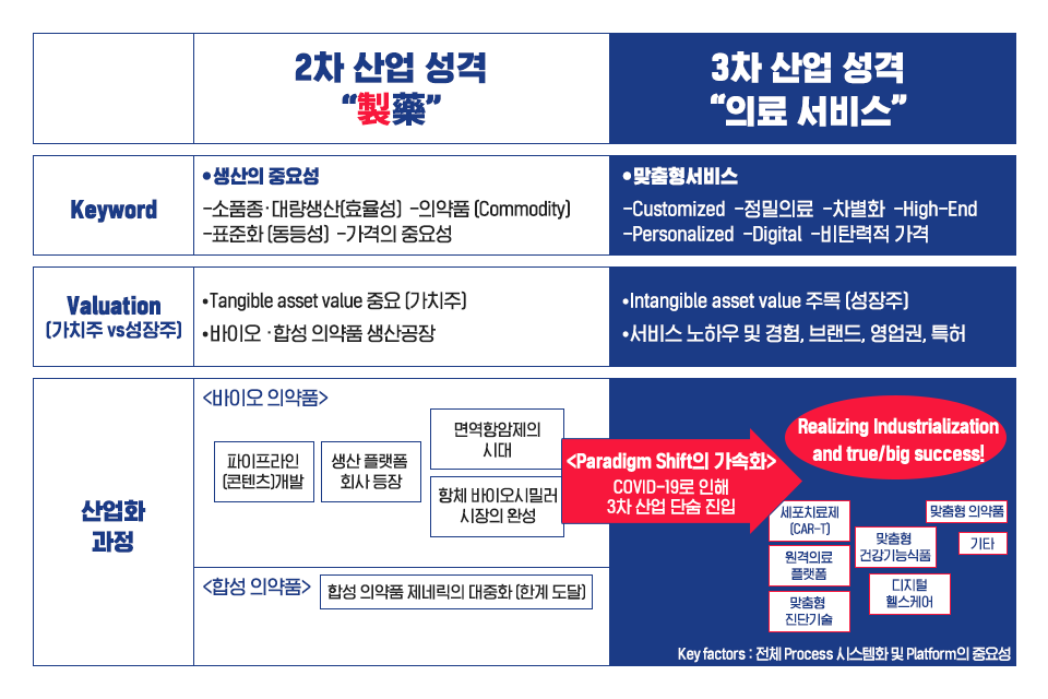 3차 산업에 대해 이야기 하기 전 2차 산업에 대한 간략한 설명이 필요할 것이다. 흔히 아시다시피 2차 산업은 생산의 효율성이 무엇보다 강조되며 소품종∙대량생산, 그리고 이를 통한 표준화로 표현할 수 있다. 헬스케어 산업의 주요 부분은 합성 의약품 또는 바이오 의약품을 생산 판매하는 제약산업이 차지하고 있는 가운데 제약의 ‘제’자가 ‘만들 제(製)’자이듯 제약산업의 핵심은 ‘생산’임을 아무도 부인할 수 없다. 아무리 혁신적 기술들이 개발된다고 하여도 이를 실질적인 산업화까지 연결하는 생산이 뒷받침되지 않는다면 그 기술들은 단순히 달콤한 꿈에 불과할 것이다. 이러한 특징은 합성 의약품 산업보단 특히 바이오 의약품 산업에서 더 두드러진다. 제조 공정이 상대적으로 간단하고 화학물질 합성 비율만 알면 똑같이 생산을 할 수 있는 합성 의약품보다 바이오 의약품은 크기가 크고 복잡한 구조로 되어 있어 이를 생산하기 위해선 살아있는 세포를 배양∙정제해야 하는 고도의 기술과 노하우가 필요하기 때문이다. 또한 바이오 의약품 제조 공장을 짓기 위해선 세계 상위 제약사들조차도 사활을 걸어야 할 만큼 막대한 비용이 들어 전 세계적으로도 현재 극히 소수의 플레이어만 이러한 생산 역량을 갖추고 있다. 이러한 생산 플랫폼을 단기간에 구축해낸 회사가 전 세계에 딱 2개밖에 없는데 그게 바로 삼성바이오로직스와 셀트리온이다. 그 외에 중국은 정부 차원의 대규모 투자를 통해 공격적으로 바이오 의약품 생산 플랫폼 확보에 나서고 있지만, 하드웨어만 잘 갖추었을 뿐 Track Record, 경험, 노하우를 갖추기에는 아직 한국과 꽤 큰 격차가 있다. 하지만, 대부분의 산업 사이클이 그렇게 흘러갔듯이, 언젠가는 중국의 바이오 의약품 (특히 단백질) 생산 플랫폼 회사들이 세계의 공장이 될 때가 바로 헬스케어 2차 산업으로의 피크가 되는 시점일 것이고 바이오 의약품은 선택된 사람들만이 사용하는 고가제품이 아니라 누구나 언제든 사용할 수 있는 Commodity/표준품으로 바뀔 것이다.