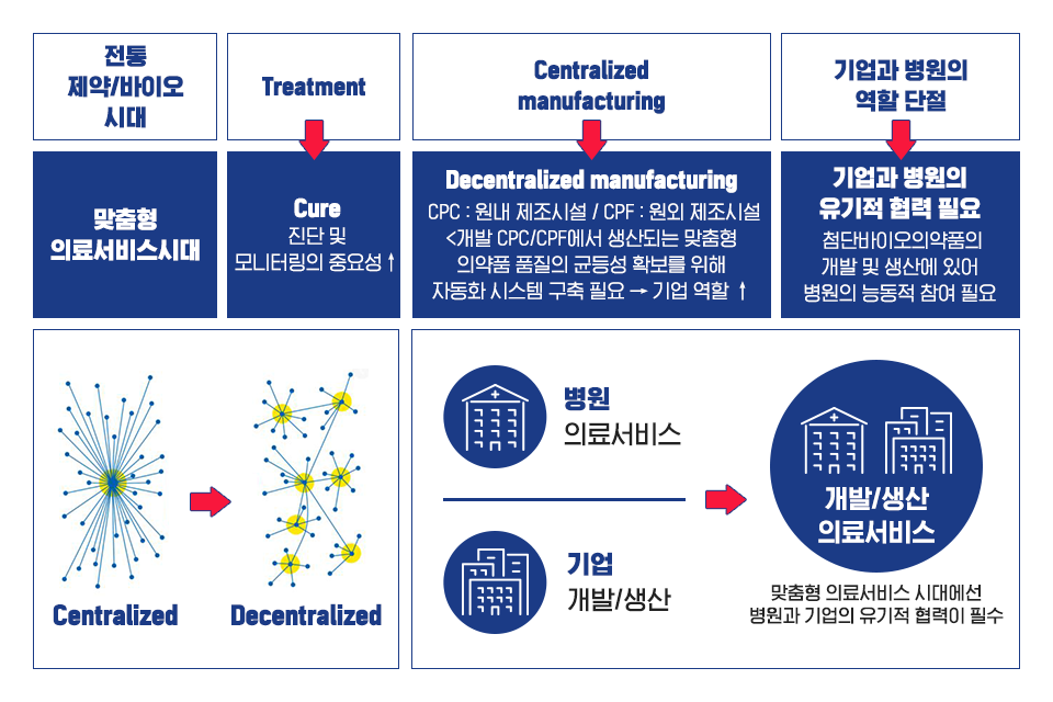 맞춤형 의료 서비스 산업은 소비자를 만족하는 방식이 경쟁력 있는 가격으로 최고의 효율적인 치료를 지향했던 기존 전통 제약산업 방식과는 조금 다르다. 대신 드라마틱한 효과와 내가 만족하는 최고의 의료서비스가 보장된다면 높은 치료 비용은 더는 고려대상이 아니라 오히려 더욱더 비싸고 아무나 사용할 수 없는 서비스여야 더 잘 팔리는 상품으로 여겨지는 명품산업과 같은 성격을 나타낼 것이다. 또한 맞춤형 의료서비스 산업에선 환자마다 각기 다른 치료제를 사용해야 하므로 효율성이 극대화된 소품종∙대량생산이 핵심이었던 헬스케어 2차 산업과는 달리 각기 다른 개별 환자의 치료제를 처방 처치하고, 환자별 데이터를 안전하고 관리할 수 있는 블록체인과 같은 기술들 등이 결합할 것이다. 이러한 성격은 최고급 서비스를 제공하는 브랜드 병원과 제조를 포함한 다양한 Value Chain을 담당하는 여러 기업들 간의 유기적인 결합과 협력을 유도할 것이며 자연스럽게 성공적인 산업화까지 이어질 것으로 예상된다.