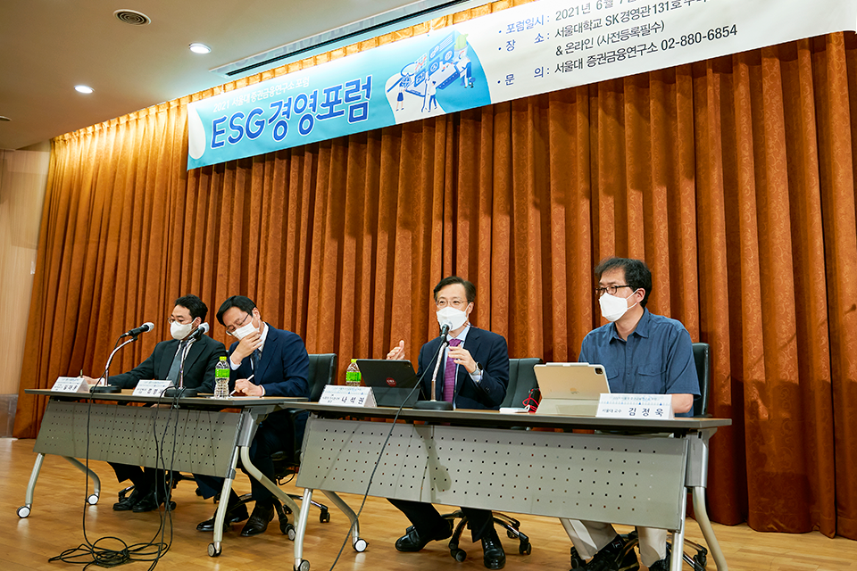지난 6월 7일 서울대학교 경영대학 증권금융연구소는 ‘ESG 경영’을 주제로 포럼을 개최했다. 본 포럼에서는 전세계적으로 경제·경영·사회 전반에 걸쳐 이슈가 되고 있는 환경·사회·지배구조(ESG)에 대한 국내 산업계의 대응역량을 강화하고 관련 리스크 관리 및 정책지원 방법을 모색하고자 전문가들이 모여 관련 이슈에 대해 이야기하는 자리를 마련하였다. 이날 열린 포럼에서는 임대웅 ECO&PARTNERS 2℃ 대표, 나석권 SK사회적 가치연구원 원장, 류영재 서스틴베스트 대표가 패널 발표자로 참여해 활발한 토론을 진행했다.