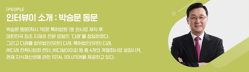‘다래’는 대한민국 최초 지식재산권 전문 로펌이다. 자문, 소송, 컨설팅에 이르기까지 지식재산권 TOTAL SERVICE를 제공하는 다래는 특허법원 판사였던 박승문 대표님의 ‘소신’으로부터 시작되었다. 지금부터 박승문 대표님의 이야기를 들어보자.