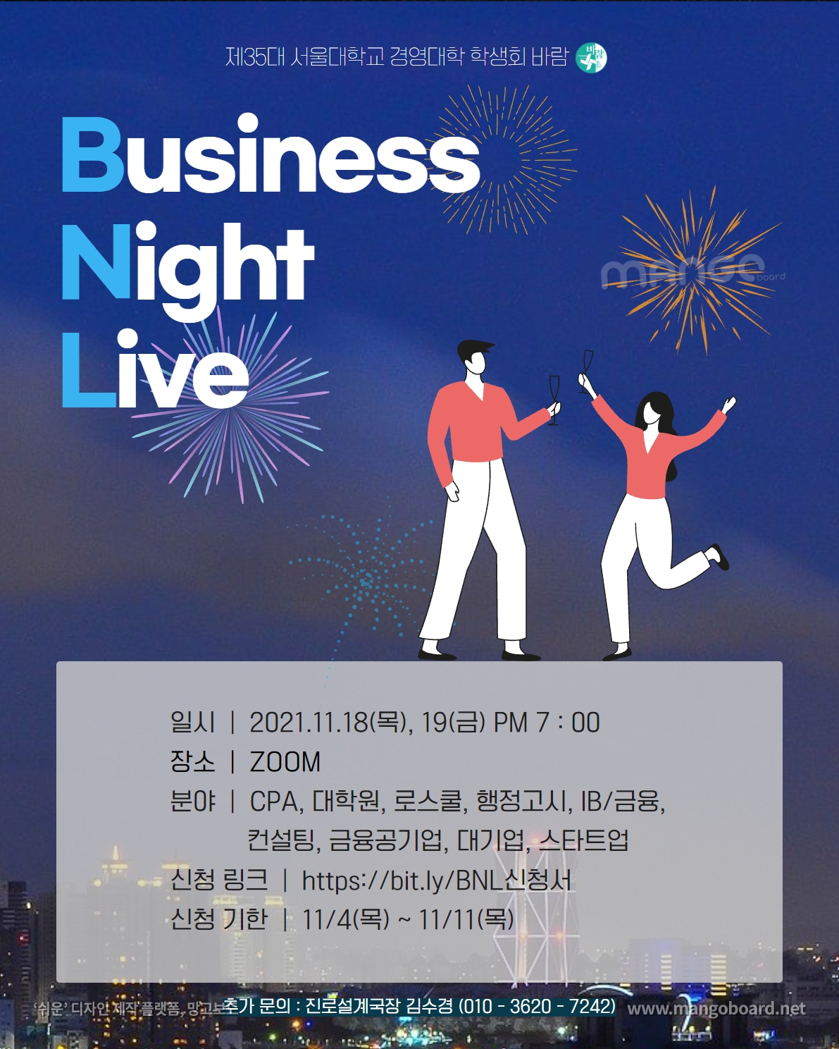 지난 11월 18일과 19일 양일에 걸쳐 경영대학 학생회에서 BNL 행사를 비대면으로 실시했다. BNL(Business Night Live)은 다양한 분야의 진로에 진입한 과정을 생생하게 전해줄 사회초년생 선배들을 연사로 초청하여 취업 및 실무에 대한 이야기를 듣는 행사이다. 이번 행사는 총 129명의 학생이 참가하였다.
