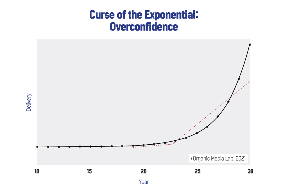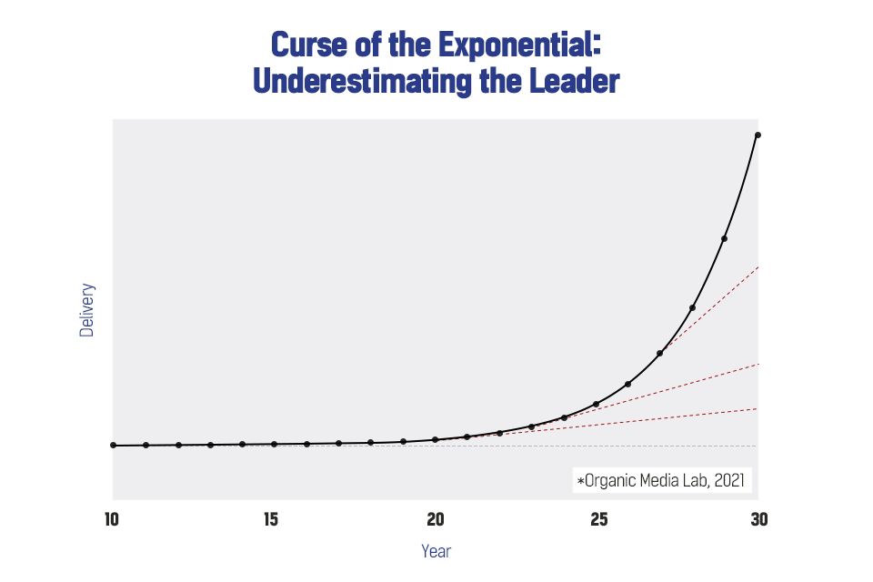 우리의 직관은 미래를 예측할 때 과거의 성장곡선에 우리를 묶어둔다. 10년 후에 기껏 2~3배 성장할 것으로 판단한다. 도표로 설명하자면 다음과 같다. 다음 도표는 2010년에 1만 대도 채 안 되는 차를 판 기업이 매년 50%씩 성장하는 것을 가정하여 그린 것이다. 실제로 2020년도에 50만대를 팔았다면, 함수적으로 2030년도에는 2,883만대를 팔게 된다. 그럼에도 대부분의 사람들은 선형적인 성장(적색 점선)에서 크게 벗어나지 못할 것이라고 예측한다. 그러니 상대의 위협을 과소평가해서 대응의 시기를 놓치게 될 뿐 아니라 니치 제품으로 간주하는 우를 범한다.