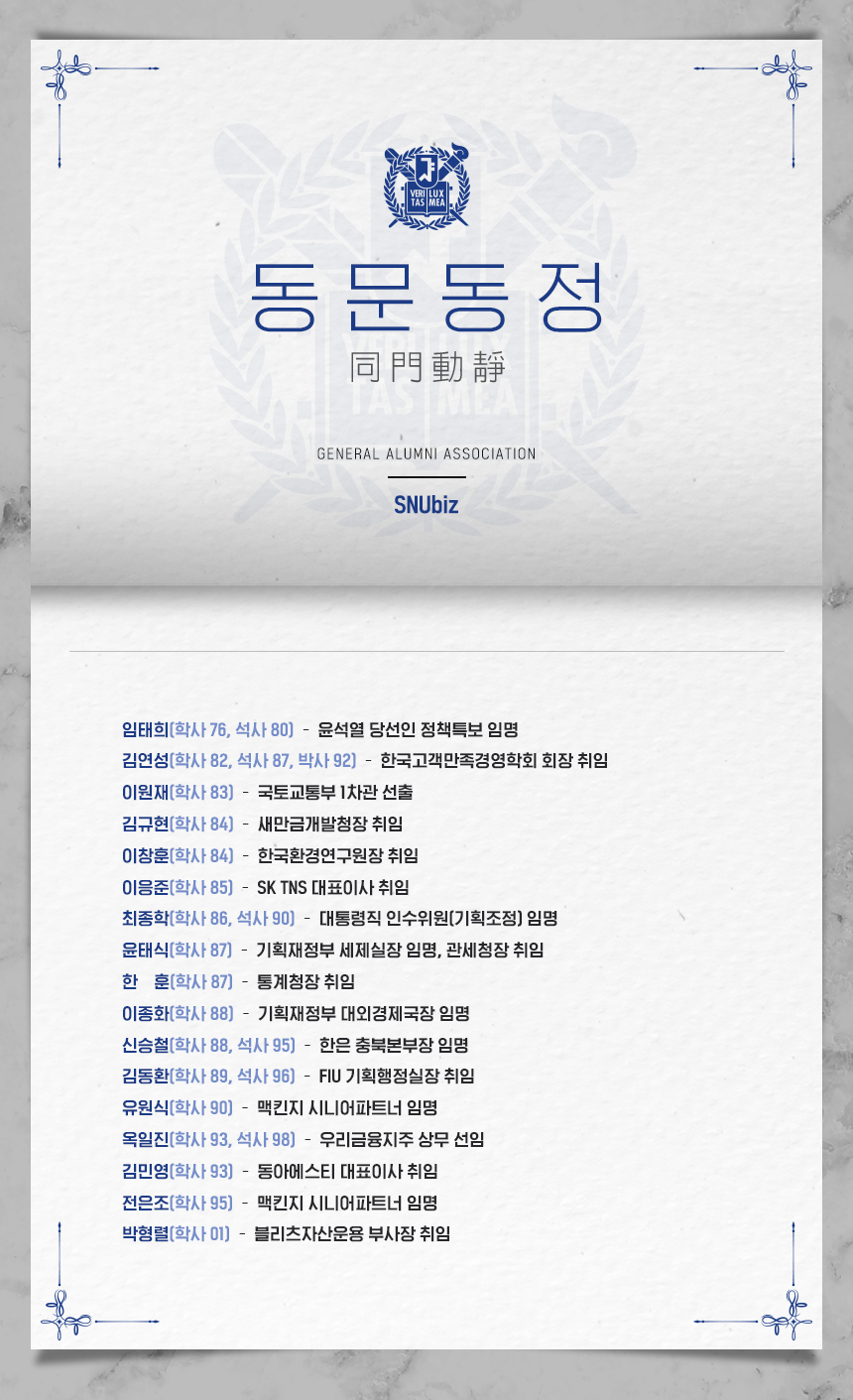 서울대학교 경영대학(원) 동문의 최신 동정입니다. (2022년 07월 기준)