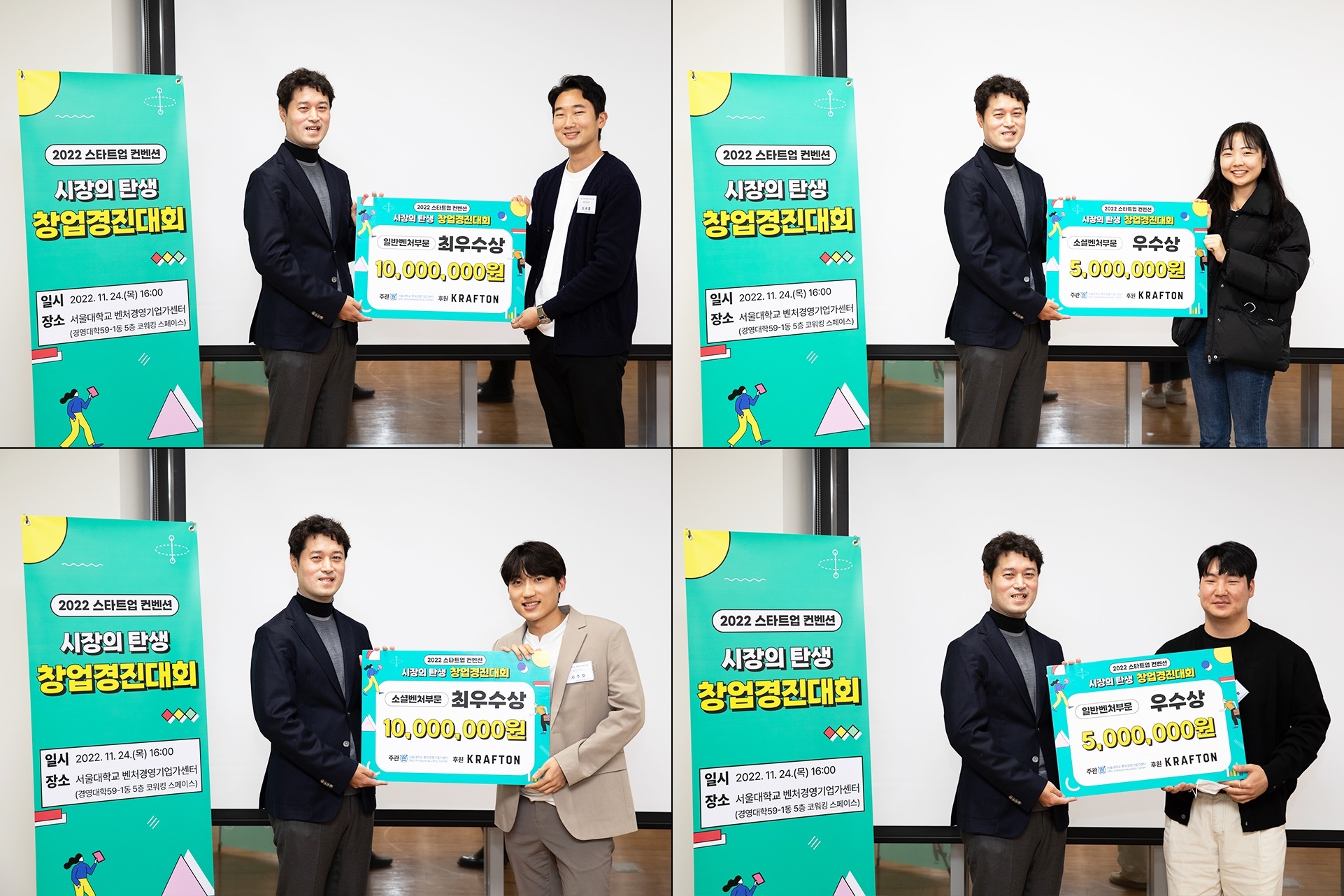 지난 11월 24일 서울대학교 벤처경영기업가센터에서 2022 스타트업컨벤션 창업경진대회를 열었다. 벤처경영기업가센터가 주관하고 KRAFTON이 후원하는 이번 창업경진대회는 벤처경영기업가센터에서 배출한 창업팀과 학내에 있는 창업팀을 발굴하여 우수 창업팀에게 실질적인 활동을 지원하는데 목적이 있다. 이번 창업경진대회는 일반벤처, 소셜벤처 두 가지 트랙으로 진행되었으며 11월초 모집을 실시하여 서류심사를 통해 최종발표심사에 총 8팀이 선발되었다.