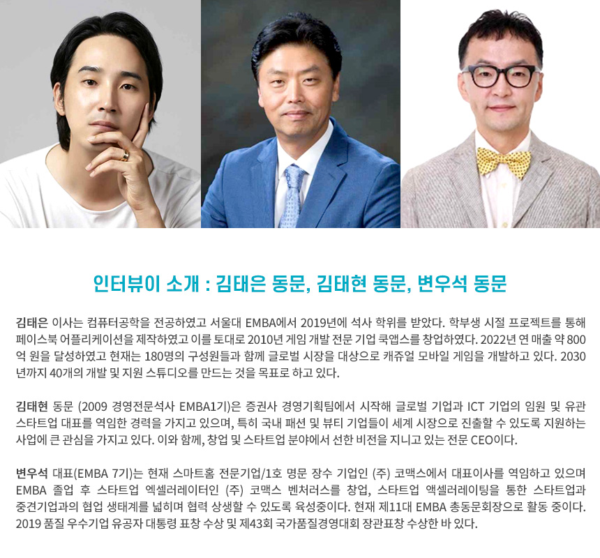 김태은 동문) 글로벌 캐주얼 모바일 게임 개발사 쿡앱스에서 창업자이자 COO로 재직 중인 김태은입니다. 컴퓨터 공학을 전공하여 대학교 3학년 시절 만난 동기와 함께 2010년 법인을 설립하여 약 13년 동안 회사를 운영 중이며 현재 180명의 구성원들과 함께 전 세계인을 대상으로 세상을 즐겁게 만들어 줄 수 있는 게임을 개발하고 있습니다. 창업 이후 실적이 지속적으로 상승하여 투자를 전혀 받지 않았기 때문에 기업 경영에 대한 외부 조언은 얻기 어려운 상황이었습니다. 그로 인해 경영학에 대한 지식의 목마름이 생겼고 서울대학교 EMBA에 2017년 입학하게 되었습니다.