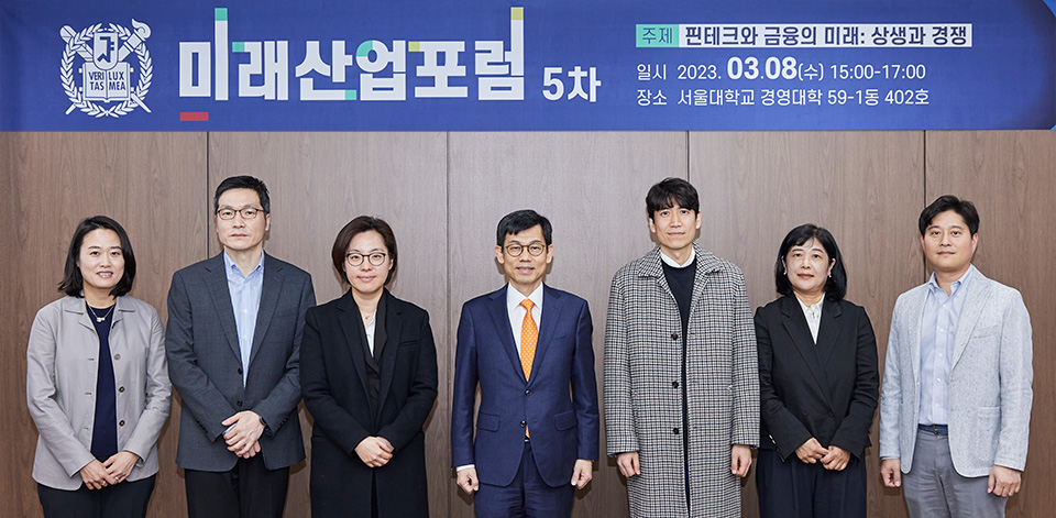 지난 3월 8일 서울대학교 경영대학에서 미래산업포럼 5차가 열렸다. 서울대학교 경영대학 벤처경영기업가센터와 매일경제가 공동주관하고, LG경영연구원이 후원하는 이번 5차 포럼에서는 학계와 업계 및 정부 당국 담당자가 모여 [핀테크와 금융의 미래 : 상생과 경쟁]을 주제로 열띤 논의를 펼쳤다. 이날 금융위원회 김소영 부위원장의 축사에 이어 주제 발표자로 서울대학교 경영대학 박소정 교수의 (핀테크와 금융의 미래 : 상생과 경쟁), 카카오페이 신원근 대표의 (상생과 경쟁, 금융 소비자 보호의 새로운 패러다임), 신한금융지주 김명희 부사장의 (디지털 생태계와 금융의 미래), 마지막으로 핀다 박홍민 대표의 (금융기관의 디지털전환에 기여하는 핀테크의 역할과 성장 방향)을 주제로 발표를 진행했다.