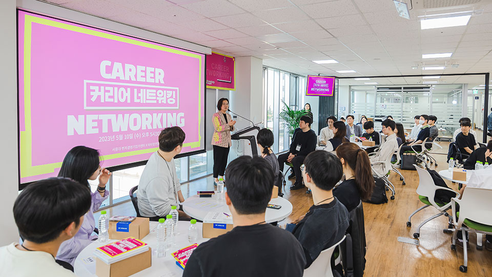 지난 5월 10일 서울대학교 경영대학 59-1동 5층 벤처경영 기업가센터에서 <커리어 네트워킹> 행사가 열렸다. 벤처경영기업가센터와 매쉬업엔젤스에서 공동주최한 이번 행사는 코로나 이후 첫 커리어 네트워킹 행사라는 점에서 학생들의 높은 신청율과 관심을 받았다.