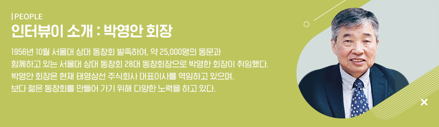 안녕하세요, 28대 서울대 상대 동창회장을 맡은 박영안입니다. 서울대 상대 25,000여 명의 동문들이 사회에서 중추적인 역할을 하고 있는데, 이런 훌륭한 동문들이 함께 만나고 소통할 수 있도록 중추적인 역할을 하는 총동창회장의 막중한 책임감이 느껴지네요. 특히, 젊은 세대들의 동참을 유도하여 선배들이 닦아놓은 전통을 후배들에게 계승해야할 의무가 있다고 생각하니 더욱 벅차네요.