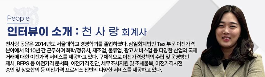 천사랑 회계사님) 저는 Tax 본부 이전가격(TP)팀 천사랑입니다. 삼일회계법인에 이전가격팀으로 입사해서 현재까지 10년 정도 근무했습니다. 현재는 화학/정유사, 제조업, 물류업, 광고서비스업 등 다양한 산업의 이전가격 문제를 해결하는 역할을 하고 있습니다. 특수관계거래를 중심으로 신규 거래가 발생하면 정책 수립을 하기도 하고, 국세청에 이전가격 관련 문서를 신고하고, 과세당국 간 협상을 지원하는 이전가격 사전승인 및 상호합의 업무, 세무조사지원 등 다양한 유형의 업무를 수행합니다. 또한 워킹맘으로서 7살 쌍둥이 남자아이들을 키우고 있습니다.