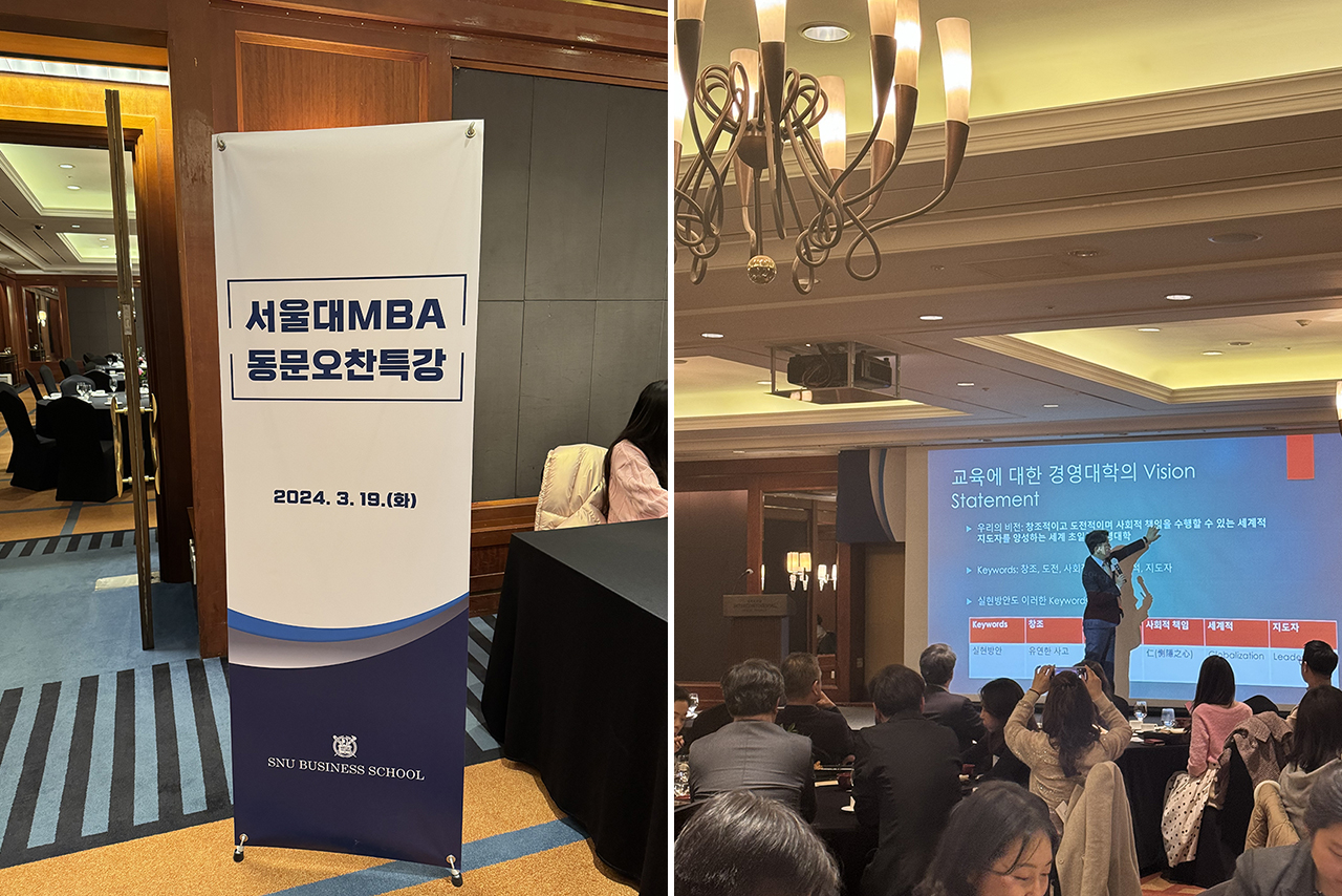 서울대 경영전문대학원(원장 채준)은 지난 3월 19일, 2024년 서울대 MBA 1차 동문오찬특강을 실시하였다. 동문오찬특강은 EMBA와 Full-time MBA 과정을 졸업한 동문들을 위한 자리로서, EMBA, MBA 동문들은 오찬을 함께 하며 서울대학교 경영대학 교수진의 강의를 수강하게 된다. 바쁜 직장 생활 중에도 동문들을 만나고 마치 학교로 돌아간 것처럼 추억을 나눌 수 있어 경영전문대학원 동문들의 호응이 높은 행사로 자리매김하고 있다.