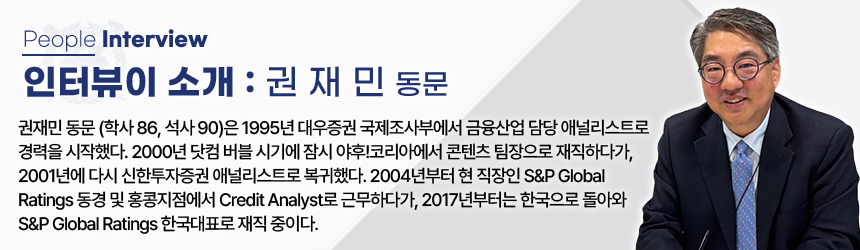 IMF 때 외국계 회사에 우리나라 회사가 많이 인수됐었는데, 그때 자연스럽게 외국계 신용평가사를 알게 됐고, 신용 평가회사가 증권회사의 주식 담당 애널리스트보다 훨씬 더 긴 호흡으로 분석을 할 수 있는 환경일 것 같아, 제 적성에 더 잘 맞을 것 같다는 생각이 들어서 2004년에 지금의 S&P로 옮겼습니다. 특히 홍콩에서 일할 때 2008년 리먼 브라더스 사태 등 글로벌 금융 위기를 거치며 또 한 번 국제금융시장에서 인사이트를 얻는 기회가 있었고, 2017년부터는 8년째 S&P의 한국 Rating 대표로서 한국으로 돌아와 활동하고 있습니다.