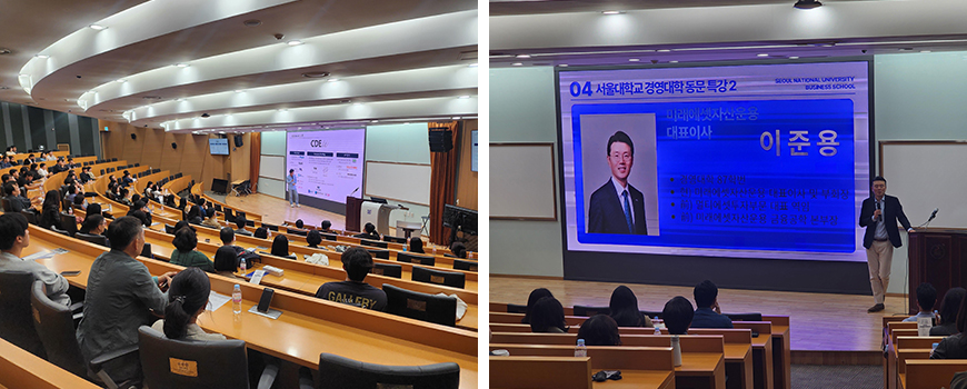 이어 자랑스러운 경영대 동문이신 ㈜에이치뮤직 엔터테인먼트 장형식 대표(경영대 97학번)와 미래에셋자산운용 대표이사 이준용 동문(경영대 87학번)의 특별 강연이 진행되었다.
