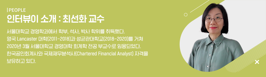 안녕하세요! 저는 올해 3월 서울대학교 경영대학 경영학과 회계학 전공 부교수로 부임한 최선화입니다. 저는 경영학과 학부를 졸업한 후 회계법인에서 일하다가 다시 대학원 공부를 시작하여 2011년 서울대 경영대학에서 회계학 박사학위를 받았습니다. 졸업 후 영국 Lancaster 대학에서 7년여 동안 근무하면서 재무회계 분야를 강의하고 연구하였고, 2018년부터 성균관대학교에서 근무하다가 이번 학기부터 서울대학교에서 일하게 되었습니다.