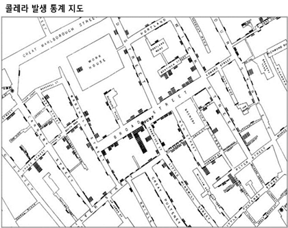 런던 소호의 한 광장에는 워터 펌프(Water Pump)가 있었다. 존 스노는 소호 지역이 그려진 지도 위에 콜레라로 사망한 사람들의 집을 표시했다. 그러자 당시 이 지역 주민들이 사용하던 워터 펌프를 중심으로 사망자들이 모여 있다는 사실을 발견했다.