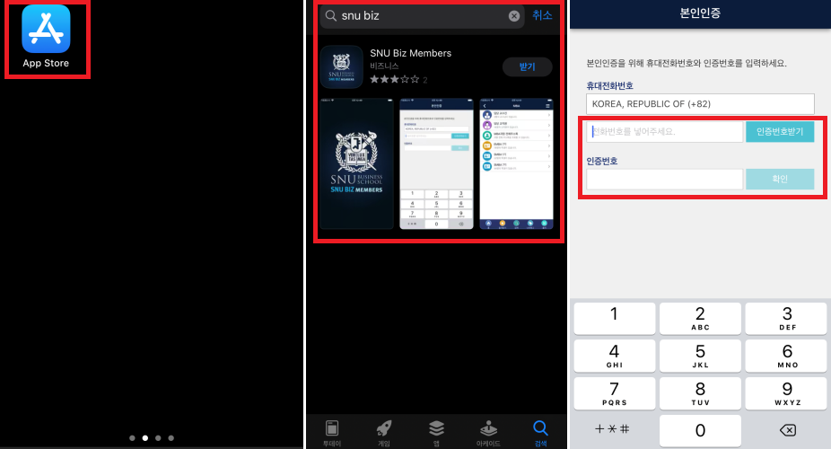 먼저, 구글 Play 스토어에서 ‘서울대 경영’ 또는 ‘SNU BIZ Members’를 검색해 해당 앱을 다운 받습니다. 앱을 실행한 후, 앱 휴대폰 접근권한을 허용하고 휴대폰 인증을 진행합니다.