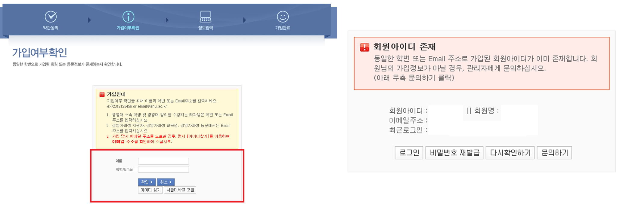 정상적으로 회원가입이 되지 않거나 문의사항이 있을 경우, 경영대학(원) 전산실(TEL. 02-880-8936)로 문의해 주세요.