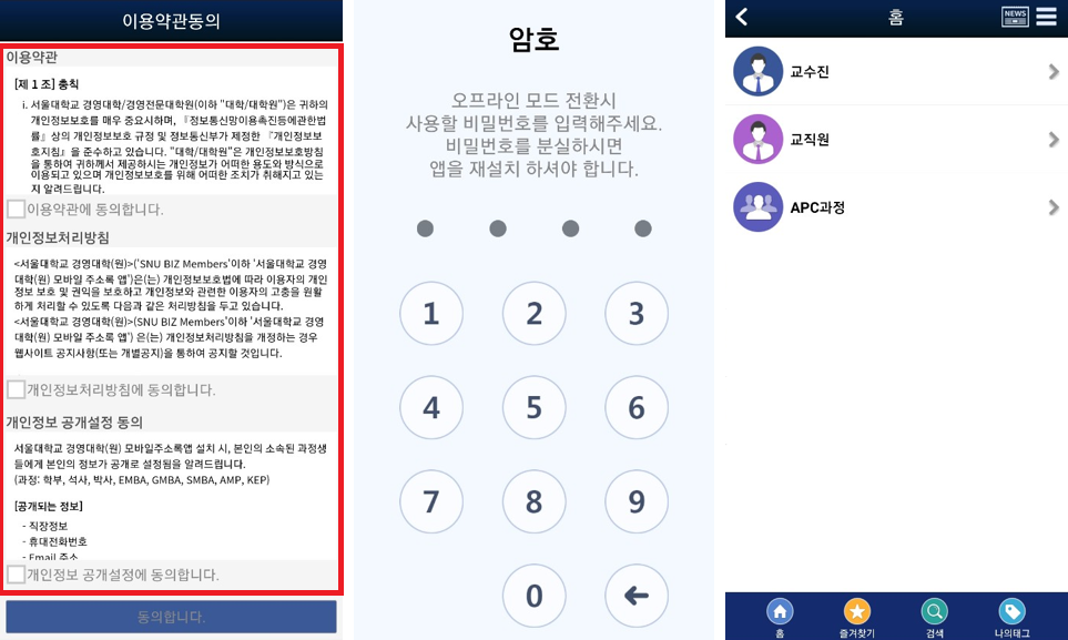 앱을 이용하기 위해선 로그인이 필요합니다. 경영대학교 인트라넷 아이디/비밀번호와 동일합니다. 이용약관에 동의하고 오프라인 패스워드를 설정한 후, 앱 정보를 동기화하고 서비스를 이용하면 됩니다.